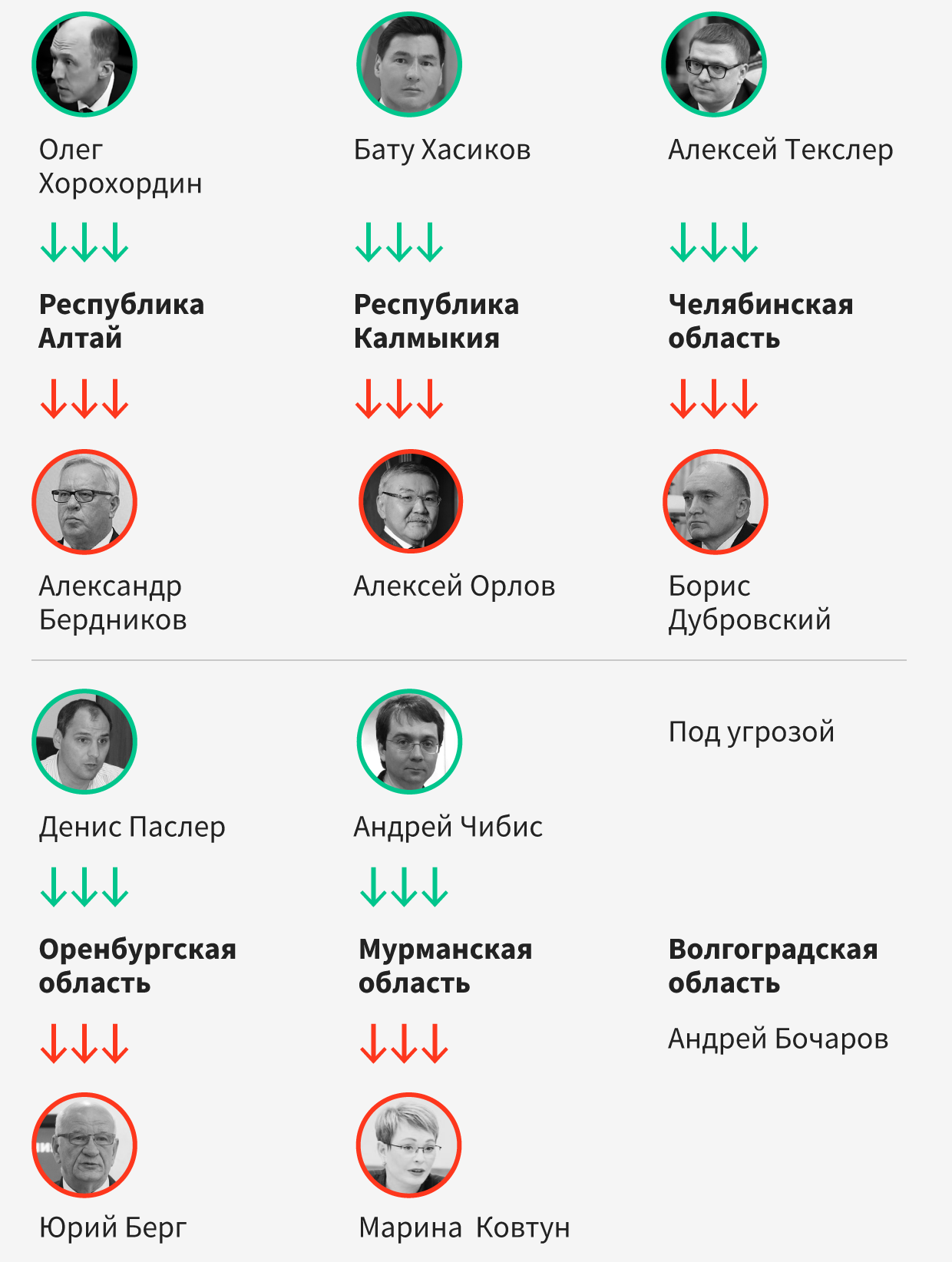 Быстрая весенняя чистка губернаторского корпуса унесла пятерых губернаторов. Все ушедшие — стареющие и/или проблемные главы сложных регионов, все пришедшие им на смену намного моложе. Рассказываем, чем известны и необычны те и другие и кто еще из губернаторов под угрозой
