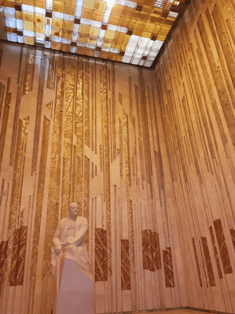К 1970 году комплекс возвели с запасом актуальности. Не только как музей, но и как центр с кино- и концертным (он актуален и сейчас) залами, торжественным залом, где до сих пор принимают в пионеры (о существовании дружины мне рассказала на месте сотрудница музея). Зал этот (Торжественный, или Ленинский) и сегодня производит впечатление культового. Возвышенное (17 метров от пола до потолка) пространство с матовым световым потолком и стенами в потоках золотой мозаики. В центре — пятиметровый сахарный Владимир Ильич. Зал похож одновременно на центрический античный мавзолей и богатый византийский храм, хотя никаких отсылок (за вычетом золотой мозаики) нет, как нет и купола. Нет в мемориале и следа архитектурных, как говорится, излишеств и украшательств — будучи монументальным сооружением, он тем не менее рифмуется с вовсе простым зданием ленинской гимназии: его горизонтальный объем также опирается на колонны, не замечая непростого рельефа.