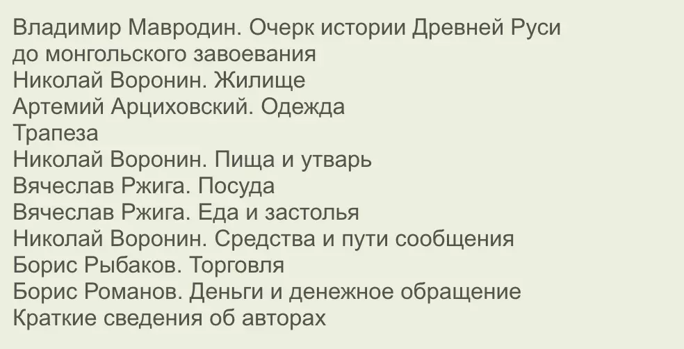 Новинкой эту книгу не назовешь: один из ее соавторов, Борис Романов, написавший классическую работу «Люди и нравы Древней Руси», скончался в 1957 году, но и сказать, что она устарела, тоже нельзя. В работе над «Бытом домонгольской Руси» участвовали крупнейшие специалисты того времени, включая Бориса Рыбакова, Николая Воронина, каждый из них писал главы по своим темам, и хотя идеологические ограничения советского времени остались в прошлом, а наука шагнула вперед, зато сейчас собрать равноценный коллектив было бы крайне непросто. Язык книги простой и лаконичный, текст совершенно без воды (даже вводная часть начинается с места в карьер) — не чета распространенной сейчас в научпопе журналистской халтуре. Отдельные главы посвящены жилищу, деньгам, средствам и путям сообщения и т. д., особенно интересна часть о древнерусской еде и застольях: