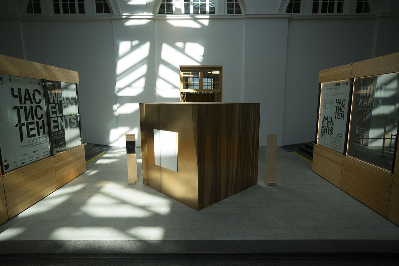Современная музейная аудитория зачастую воспринимает информацию потребительски, ведь люди ходят в музеи для того, чтобы их развлекали, — это итог капиталистического устройства современной культуры. Парадоксально, но не все заметили объект, который открывал выставку «Части стен 2» в ЦВЗ «Манеж»: огромный золотой куб работы Adno.