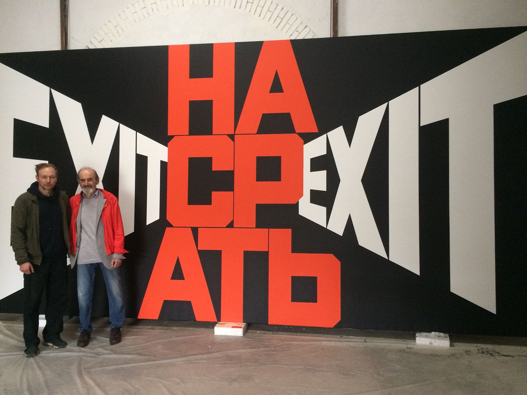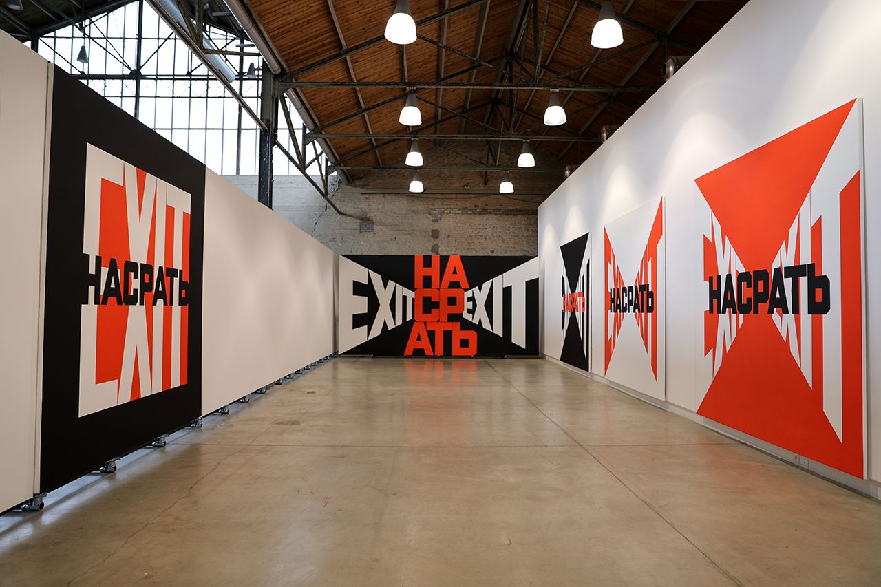 В бельгийском городе Шарлеруа до 19 мая идет выставка Black Horizon, на которой показывают работы современного российского художника Андрея Молодкина и классика советского нон-конформизма Эрика Булатова (оба живут в Париже). Объекты Молодкина — это «кровавое караоке»: пластиковые скульптуры в виде строк из песен заблокированной на ютьюбе группы, которые с помощью помпового насоса заполняются кровью посетителей выставки. Булатов написал традиционную для себя серию картин с изображаемыми в разных плоскостях словами «exit» («выход») и «насрать», а также трехметровую композицию из черной стали «Всё не так страшно». По просьбе «Медузы» журналист и телеведущий Владимир Раевский съездил на выставку и поговорил с художниками о том, почему для своих работ они выбрали именно эти слова.