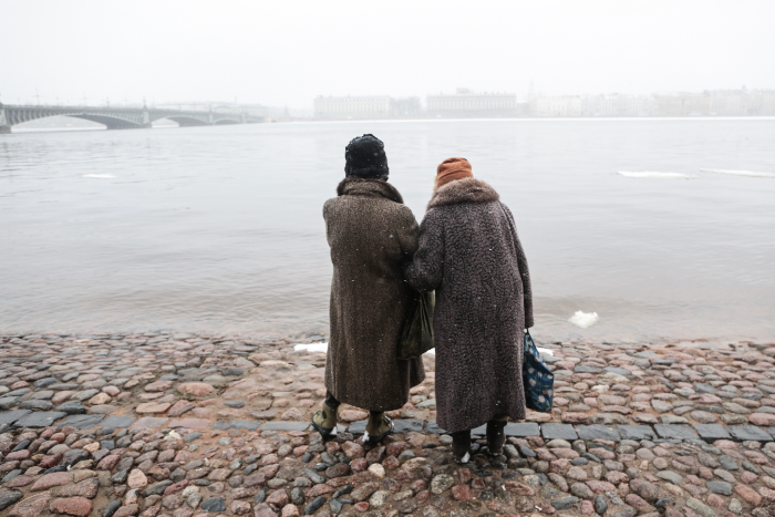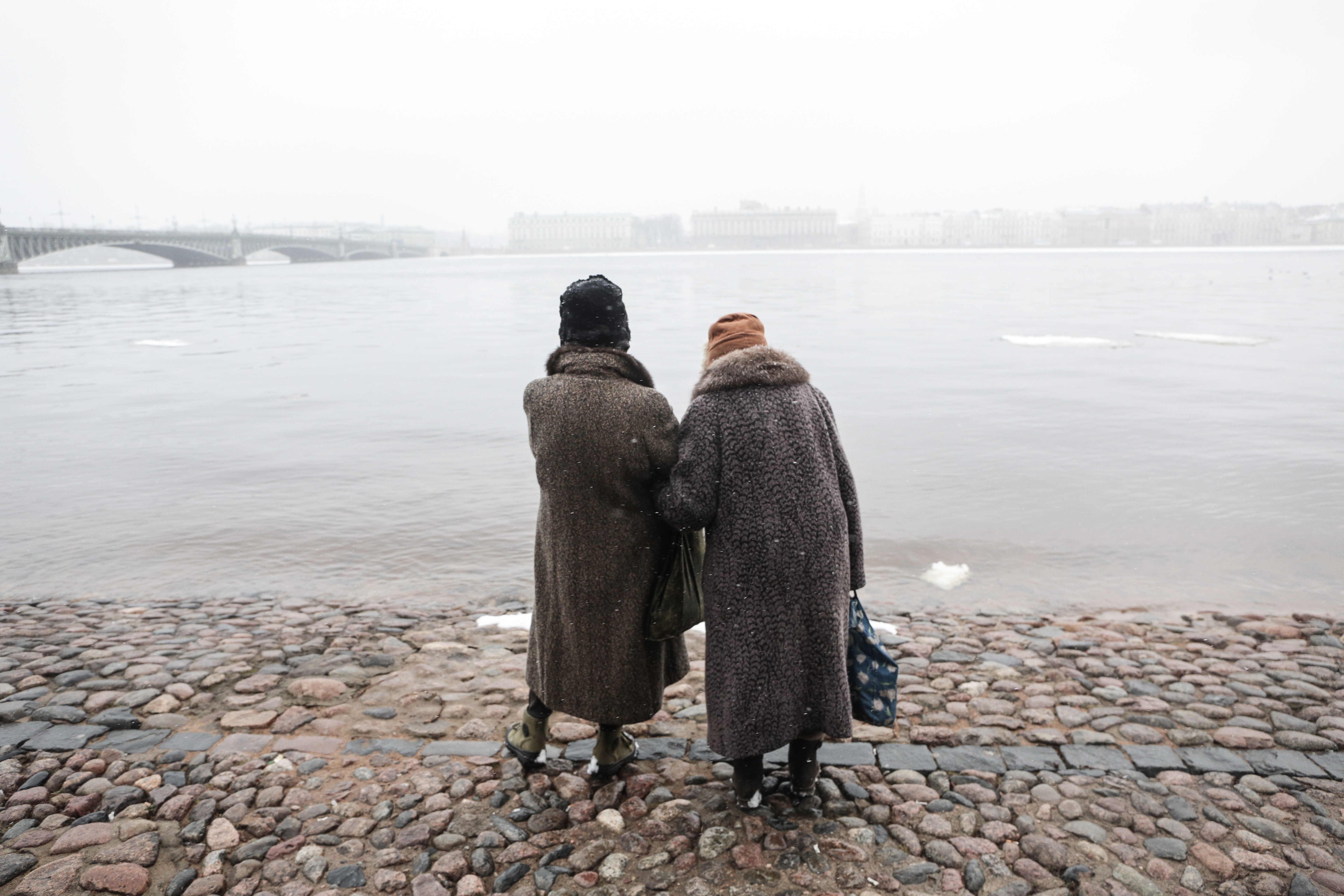 «Бумага» публикует одну фотографию, на которой петербурженки наслаждаются видом на Неву в снегопад.