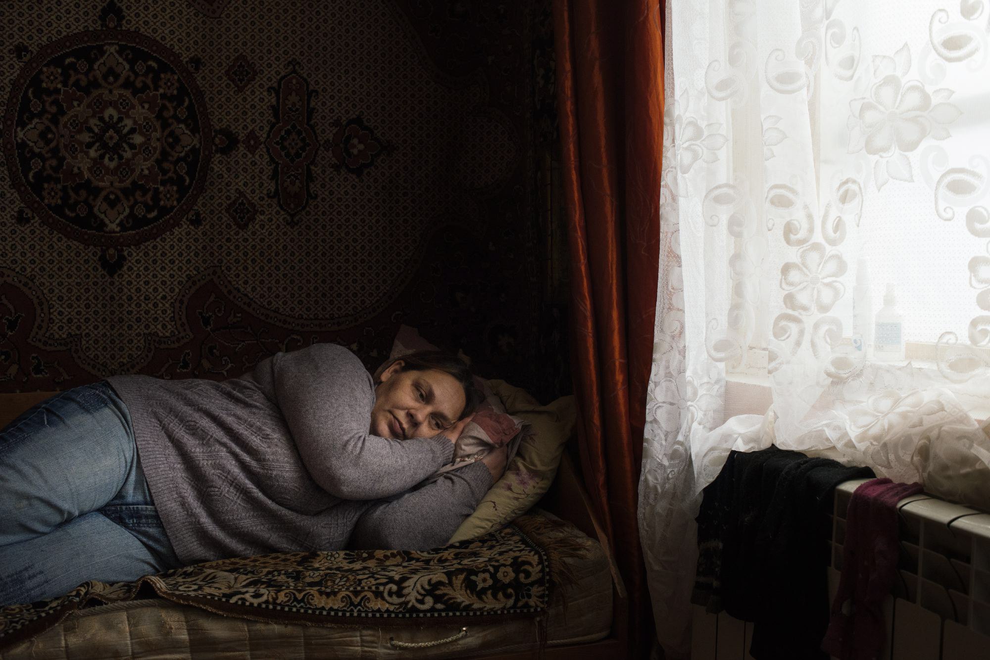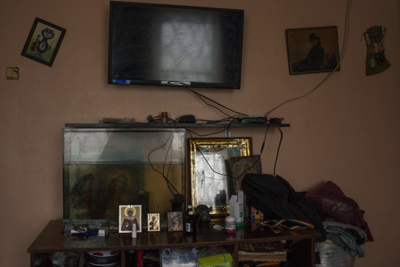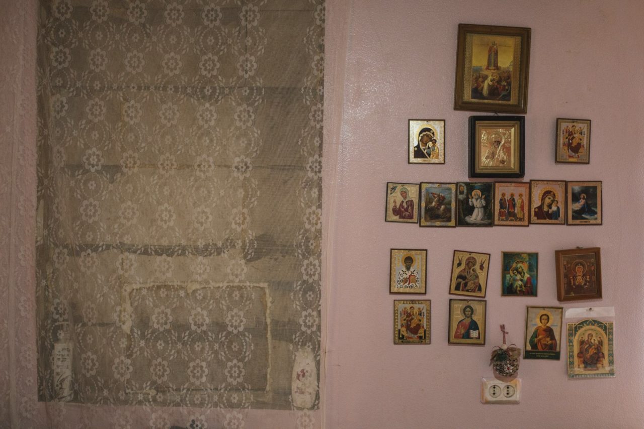 На пороге меня встретила Анжелика — полноватая женщина средних лет. Она передвигалась, опираясь на трость. В холодном узком коридоре было полно хлама, над дверью — икона. Хозяйка пригласила нас в большую темную комнату с низким потолком. В нос ударила нестерпимая вонь. Анжелика пояснила, что это запах от дров. В комнате из мебели оказались старый комод, на нем аквариум без рыбок, односпальная кровать и разложенный диван, застеленный застиранной простыней. Пол из фанеры. Источник света — лампочка с дешевым пластиковым плафоном.