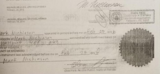 Под соглашением стоит подпись Марка Никинсона. Ее заверил нотариус по фамилии Пейт (Pate) с русским именем Олег. Второй автограф якобы принадлежит Валерию Пшеничному. И он нотариусом не заверен.