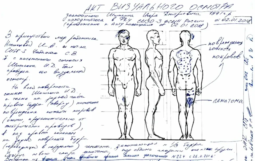 Фельдшер СИЗО, так описавший травмы Шишкина, явно не случайно употребил термин «мелкоточечные удары», а не ожоги – как описали эти повреждения на теле Шишкина члены ОНК Петербурга Екатерина Косаревская и Яна Теплицкая, добившиеся его осмотра в присутствии начальника и медика изолятора 2 февраля. Осмотр велся под видеорегистратор, работали установленные в помещении стационарные камеры (записи с них потом ожидаемо объявят «не сохранившимися»). Правозащитницы зафиксировали десятки точечных ожогов на теле Шишкина, отрисовав их расположение на схематичном изображении человеческого силуэта (фотографировать членам ОНК не дают). Игорь при этом был раздет до трусов; до того, чтобы снять их в присутствии девушек, дело не дошло.