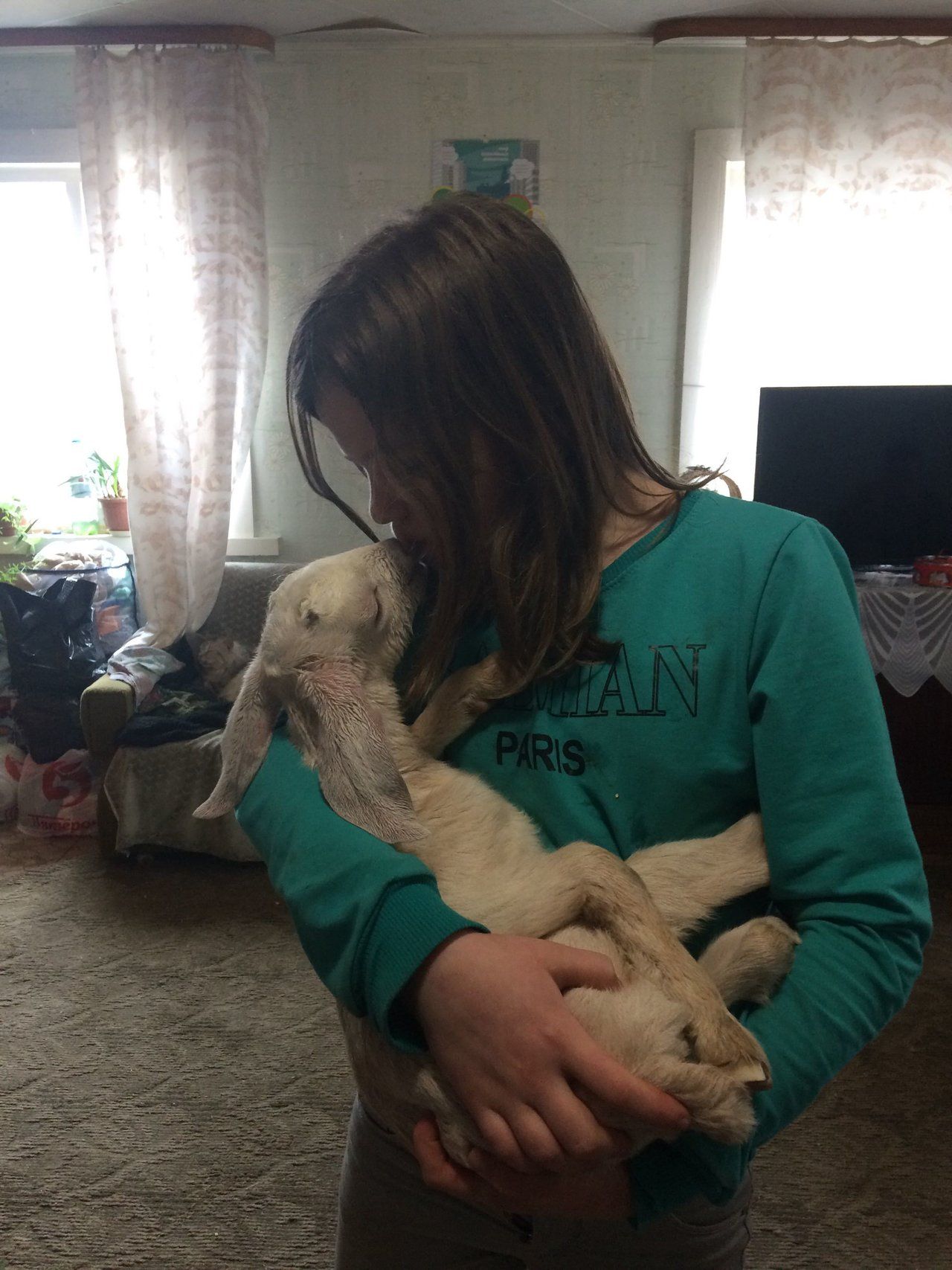 The first to greet me as I approach the front door is a white baby goat named Portos, who licks my hand and promptly begins jumping around me. Twelve-year-old Tasya appears behind him on the threshold. She gives me a tight hug and tries to lift me up, though she doesn’t even know my name. Her mother, Yelena, who has emerged behind her, asks me not to be startled: “Tasya loves everyone, even investigators and journalists from state TV channels.”