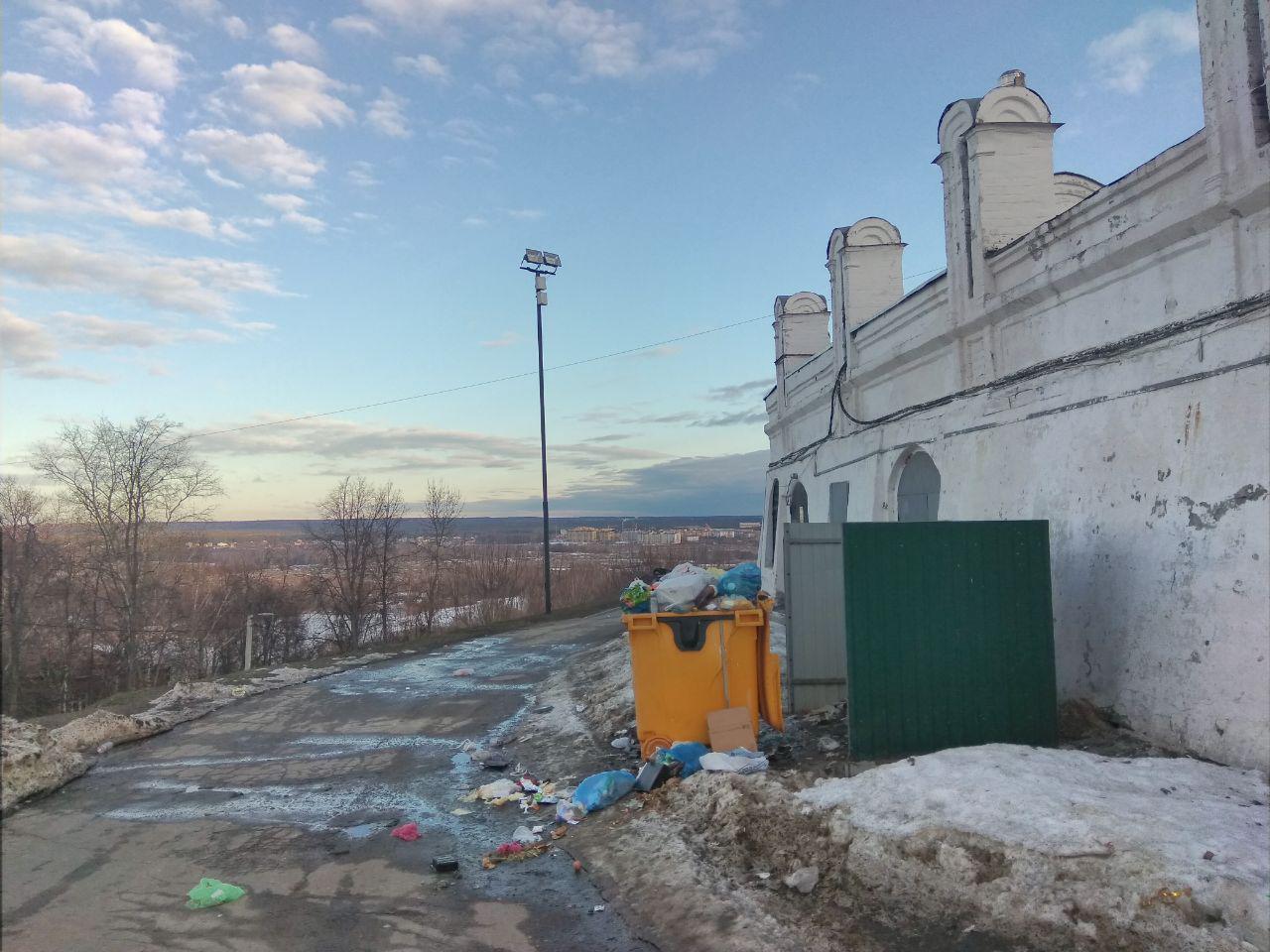 Возле одного из древнейших памятников архитектуры нашей области нерегулярно вывозят мусор. Мусорный контейнер расположен возле здания Успенского собора рядом с пешеходной дорожкой, ведущей из парка Пушкина вдоль собора к зданию Палат. Не поместившийся внутрь мусор служители сложили рядом с контейнером.