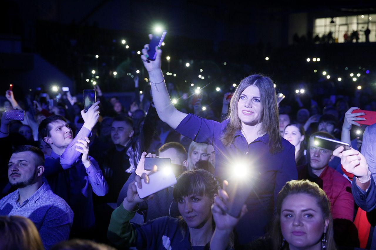 Под конец выступления на сцену выходит маленькая девочка, исполняет гимн Украины, ей подпевает весь стадион, а потом Зеленский с улыбкой произносит речь — мол, зачем агитировать, на стадионе собрались люди умные, «вы и так знаете, что вам делать 31 марта» (то есть в день выборов). «Есть ощущение, что мы с вами живем последние 28 лет в каком-то дремучем лесу, — говорит он. — Действительно темно и нет света. И какие-то люди нас пытаются провести, вывести на свет, нам с вами что-то обещают. Но ощущение, что нас с вами водят в этом лесу по кругу. Поэтому, пожалуйста, 31-го числа поднимите вверх глаза и найдите своими светлыми глазами, настоящими глазами украинцев, найдите свет».