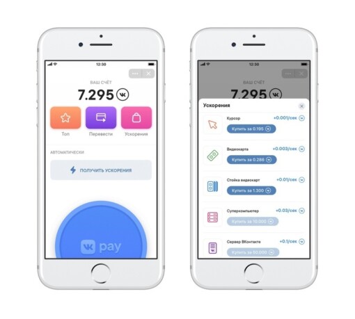 Деньги можно потратить только на ускорители, которые позволят зарабатывать валюту автоматически или перевести другим пользователям. Каждое касание по кнопке приносит 0,001 VK Coin.