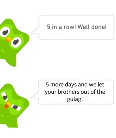 Вскоре в соцсетях распространились шаблоны с фразами совы из приложения. В них птица со злобным выражением лица рассказывает пользователю, что угадать пять слов подряд — недостаточно, для того, чтобы она выпустила родственников на свободу.