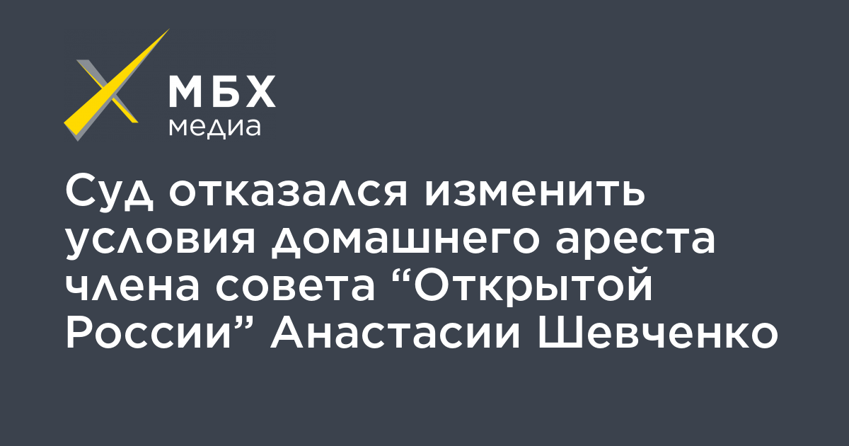 Суд в Ростове-на-Дону отказался изменить условия домашнего ареста члену совета общественной организации «Открытая Россия» Анастасии Шевченко, жалоба на отказ суда принять соответствующее ходатайство была отклонена. Об этом «МБХ медиа» сообщил адвокат Сергей Бадамшин.