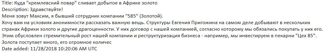 28 ноября 2018 года в форму обратной связи на нашем сайте пришло сообщение от человека, рассказавшего, что его зовут Максим и он является менеджером по продаже ювелирных изделий в сети магазинов "585 Золотой". По словам автора сообщения, ему стало известно, что добываемое компаниями Евгения Пригожина африканское золото вывозится из Центральноафриканской республики и продается в виде украшений через сеть магазинов "Золотого". В качестве контакта для обратной связи "Максим" оставил адрес электронной почты сервиса ProtonMail, обеспечивающего шифрование сообщений – "krpovar@protonmail.com".