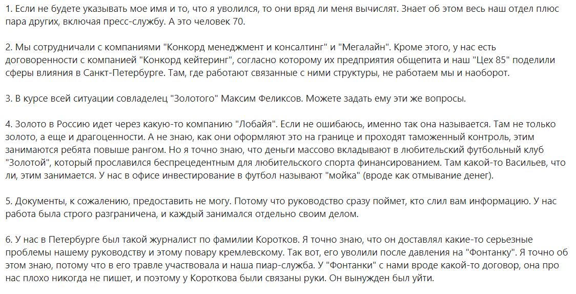 Радио Свобода вступило в переписку с "Максимом", задав ему несколько уточняющих вопросов и попросив предоставить какую-либо информацию в подтверждение своих заявлений. В ответ мы получили сообщение, в котором утверждалось: "585 Золотой" сотрудничала с компаниями Пригожина "Мегалайн" и "Конкорд менеджмент и консалтинг", а также компанией "Конкорд кейтеринг", с которой принадлежащая "Золотому" сеть пекарен "Цех 85" поделила сферы влияния в Санкт-Петербурге. Также "Максим" рассказывал, что золото поставляется из Африки через компанию Lobaye Invest, которую авторы независимых расследований связывают с Пригожиным и которая получила от правительства ЦАР концессии на разработку золотых месторождений в ЦАР. По словам нашего собеседника, он знал и о том, что журналиста Дениса Короткова уволили из издания "Фонтанка" после давления со стороны структур Пригожина. Предоставить какие-либо доказательства своей причастности к компании "585 Золотой" "Максим" отказался, сославшись на то, что это поставит его под угрозу.