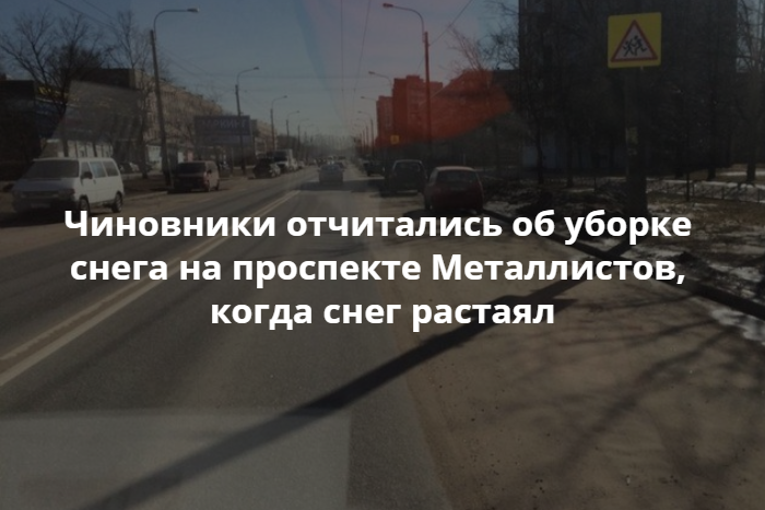Пользователь пожаловался на то, что на проспекте Металлистов снег свален к припаркованным автомобилям. По его словам, сугробы мешали выезду. На его обращение ответили 4 апреля, прикрепив к ответу фотографии улицы, на которой растаял снег.