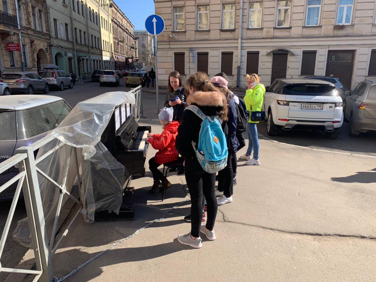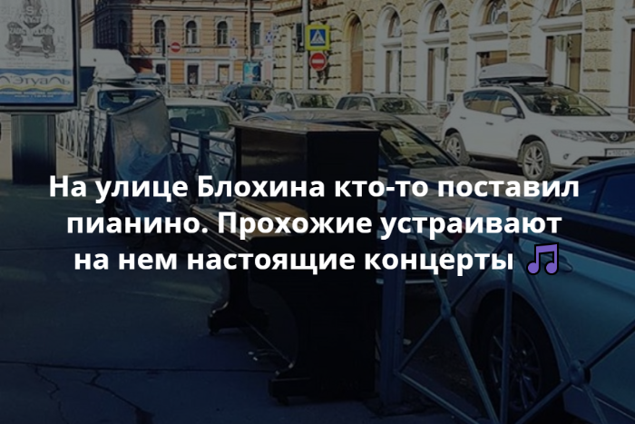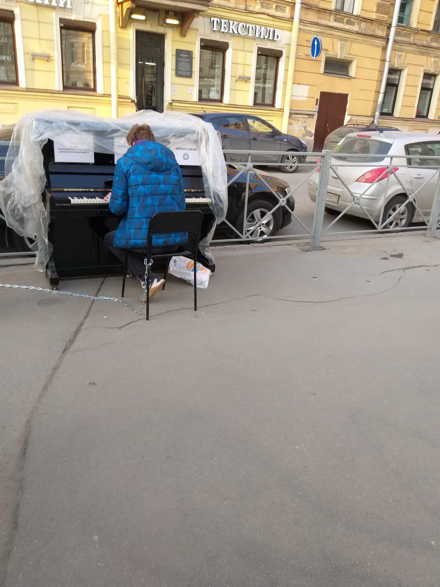 В Петербурге на улице Блохина уже несколько дней стоит пианино. Кто его хозяин — не известно. Но играть на инструменте разрешено всем желающим. Петербуржцы с удовольствием пользуются уличным пианино и устраивают настоящие концерты.