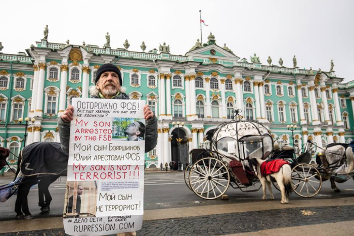 Петербургские активисты провели акцию в поддержку фигурантов дела «Сети», которых подозревают в создании террористической организации. Участники сфотографировались у достопримечательностей с плакатами «Осторожно, ФСБ», «Мыслить свободно не преступление».