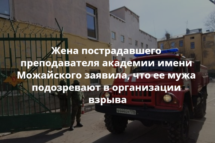 Жена одного из пострадавших в академии имени Можайского, полковника и преподавателя академии Рифата Закирова, рассказала, что ее мужа подозревают в организации взрыва. Она опубликовала пост на своей странице во «ВКонтакте».
