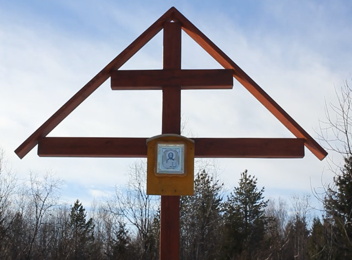 Следующий пункт нашего путешествия — поклонный крест. Это массивный крест из крепкого дерева, установленный местными жителями на месте бывшего поселка Шиес (сейчас этого поселка не существует, хотя даже среди активистов есть те, кто родился именно в Шиесе).