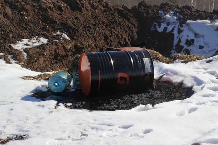 Немного передохнув, мы продолжаем прогулку по территории полигона. Вот с этой горы глины видно, как работают экскаваторы на другом конце полигона, вот тут мы видим бочку с разлитым топливом, впитывающимся в грунт и беспрепятственно попадающим, надо полагать, в подземные воды, а здесь — большую железную бочку, в которой работники полигона сжигают свой мусор. Местные писали жалобы в Росприроднадзор на эту мусоросжигательную бочку, но работники полигона ее постоянно перемещают, что вводит несчастный Росприроднадзор в состояние фрустрации, и те регулярно беспомощно отчитываются о том, что никакой бочки не найдено.