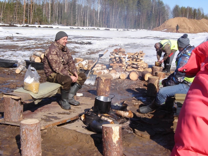 Подъезжаем к первой точке вахты — «костру», преграждающему путь на полигон с северо-западной стороны. «Руки прочь от Шиеса!!!» — надпись на растяжке, установленной на повороте. Много машин приехавших на вахту активистов, много вырвавшихся наружу из неспокойных душ призывов и лозунгов на плакатах, желтые жилетки с подписью «Народный контроль» и нашивками «Поморье не помойка!» — все пестрит в глазах и переливается на ярком утреннем солнце. Вахтовики предлагают нам горячий суп и чай — вежливо отказываемся (недавно завтракали) и намекаем, что суп с чаем пригодятся позже, когда мы вернемся с полигона. Несмотря на некоторое недоверие к журналистской братии после многочисленных случаев переворота событий, происходящих на вахте, с ног на голову — гомон веселых и не очень разговоров не стихает, сразу же образовалось несколько групп: журналистки и блогеры берут интервью у активистов и просят их поколоть дрова для красивого кадра.