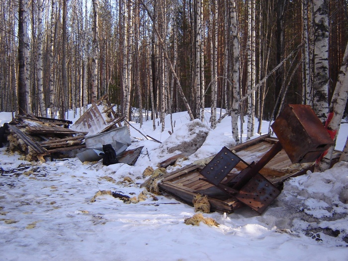 После визита на полигон шведов наш блог-тур отправился осматривать место бывшей вахты на дороге с Шиеса на Мадмас — туда, где экскаваторщик (который, как впоследствии выяснилось, на самом деле никакой не экскаваторщик, а простой механик, даже не имеющий права управлять строительной техникой) в невменяемом состоянии поломал ковшом вагончик вахты, в котором находился человек, придавил им же одного из активистов и без всякого сожаления двигался на стоящих на пути механизма людей. Обломки вагончика оказывают удручающее и обескураживающее воздействие на психику — кажется, что вот так же, массивной строительной техникой, проектировщики и работники полигона могут в два счета поломать судьбы живущих здесь людей, построив злосчастный «ЭкоТехноПарк „Шиес“», не озираясь ни на какие рамки не только морали и нравственности, но и законов страны (напомню, что в данный момент все работы ведутся в отсутствие какой-либо проектной документации, экологической экспертизы, оценки воздействия на окружающую среду и общественных слушаний).