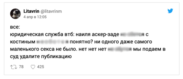 [Может быть ситуация], когда Роскомнадзор сам берёт и отслеживает любую информацию, в которой Наиля Аскер-заде упоминается в связке с банком ВТБ. Тогда это, наверное, будет самая защищённая журналистка и женщина России, если Роскомнадзор ставит её в выборку — как бы о ней что-то не написали.