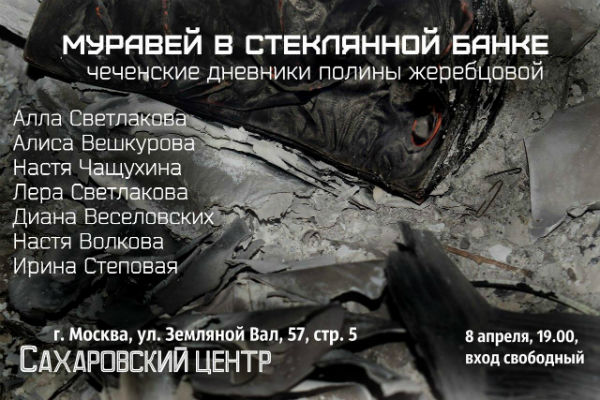 8 апреля в 19:00 в Сахаровском центре в Москве будет показан спектакль детского пермского театра "Пилигрим" по книге Полины Жеребцовой "Муравей в стеклянной банке. Чеченские дневники 1994 - 2004".