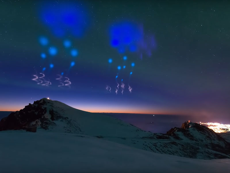Как пишет N+1, цепочки из ярких зеленовато-голубых пятен возникли в небе на короткое время в результате пуска с территории космического центра Андоя двух геофизических ракет в рамках проекта NASA AZURE. На высоте эти ракеты распылили частицы триметилалюминия, бария и стронция, что и привело к возникновению свечения.