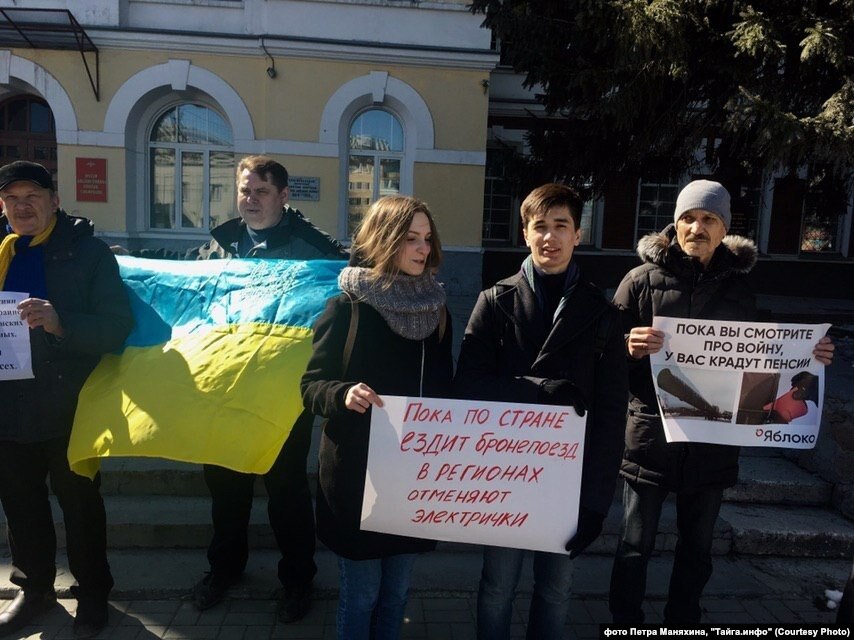 Участники акции держали плакаты: "Пока вы смотрите про войну, у вас воруют пенсии", "245 миллиардов рублей – стоимость военной кампании в Сирии. Это примерно 400 школ или 50 больниц. Стреляя по чужой стране, мы разрушаем свою", "Пока по стране ездит бронепоезд, в регионах отменяют электрички".