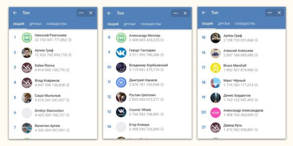 В приложении VK Coin есть общий топ игроков, которые набрали больше всего внутренней валюты. Из первой сотни более 30 профилей связаны с куплей-продажей «коинов» — это видно по характерным аватаркам и именам.