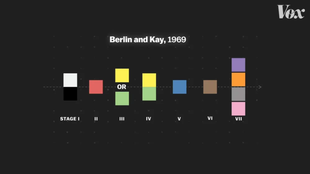В 1969 году вышла их книга (Berlin B., Kay P. Basic color terms: their universality and evolution. Berkeley: University of California Press, 1969), в которой на примере 20 языков показано, что порядок появления цветообозначений в разных языках мира одинаков: во всех языках есть обозначение белого и черного; если в языке три базовых цвета, то третьим становится красный; следом появляются желтый и зеленый либо одно слово для обозначения желтого, синего и зеленого цветов. Эта последовательность универсальна. Если в языке есть слово для обозначения коричневого цвета, то в нем обязательно есть названия и для всех предыдущих в этой цепочке цветов. Если нет отдельного названия для зеленого, то не будет и отдельного названия для синего, так как обозначение синего обычно появляется позже обозначения зеленого.