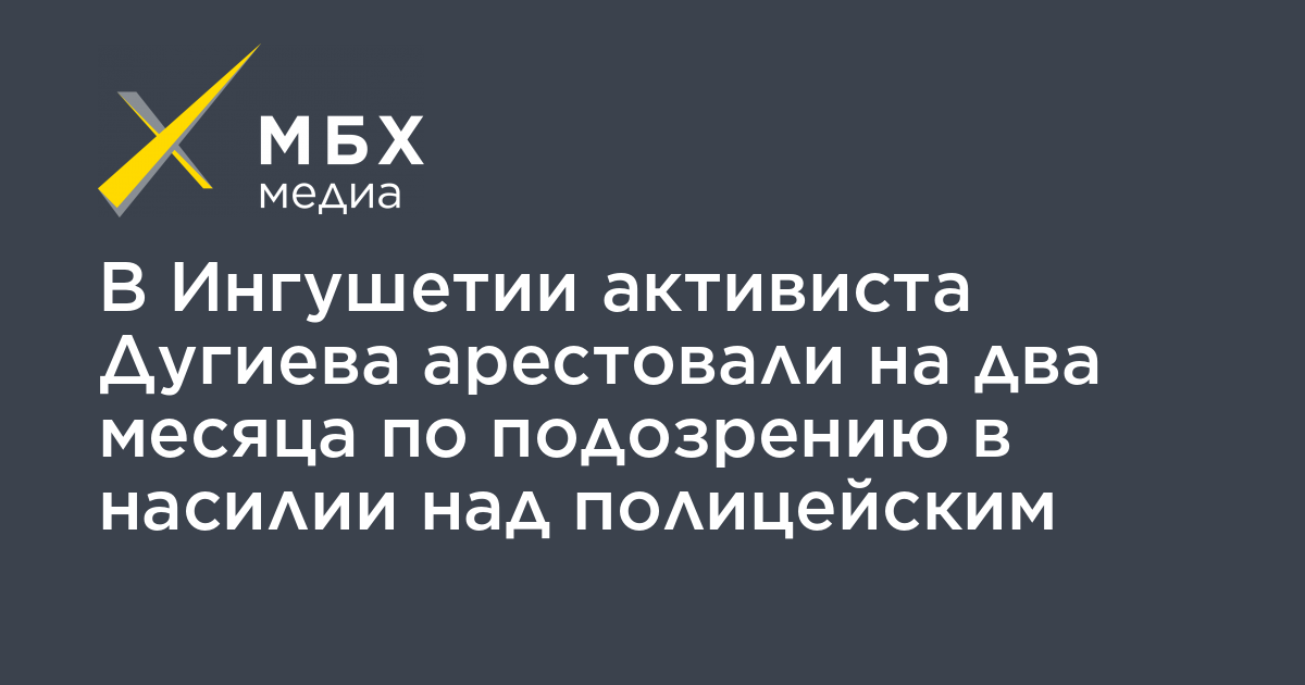 В Ингушетии задержанного накануне участника акции протеста против соглашения о границе с Чечней Ибрагима Дугиева на два месяца арестовали по подозрению в применении насилия к представителю власти, об этом «МБХ медиа» сообщил адвокат Магомед Абубакаров.