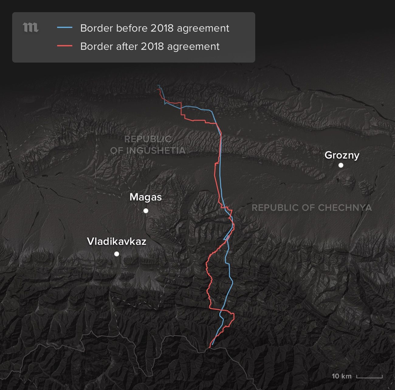 The text of the 2018 agreement announces an “equal exchange of uninhabited territories in the Nadterechny District of Chechnya and the Sunzhensky District of Ingushetia.” However, independent calculations have demonstrated that the agreement gave Chechnya a disproportionately large quantity of land — one approximately 25 times the size of the territory Ingushetia received in return. The deal decreased Ingushetia’s area overall by seven percent, and for the most densely populated republic in Russia, that is a noticeable difference.