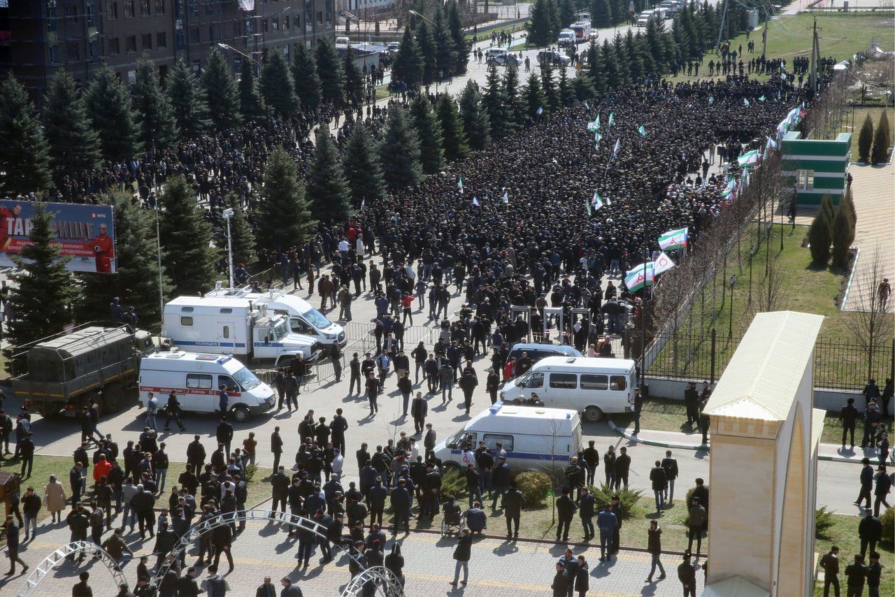 On March 26, thousands of people reemerged onto the streets of Magas. This time, they demanded both the return of the lost paragraph in the referendum law and the resignation of the head of the republic. Unlike the previous fall’s protests, this one was approved by local authorities. However, the government legalized only one of the three days organizers had requested, and it was a Tuesday — a work day — with government approval extending only until 6:00 in the evening. Thousands of people gathered on Idris Zyazkov Prospect: opposition leaders claimed that the crowds reached 30,000 in total. Protesters traveled to Magas not only from all of Ingushetia but from other cities in Russia as well.