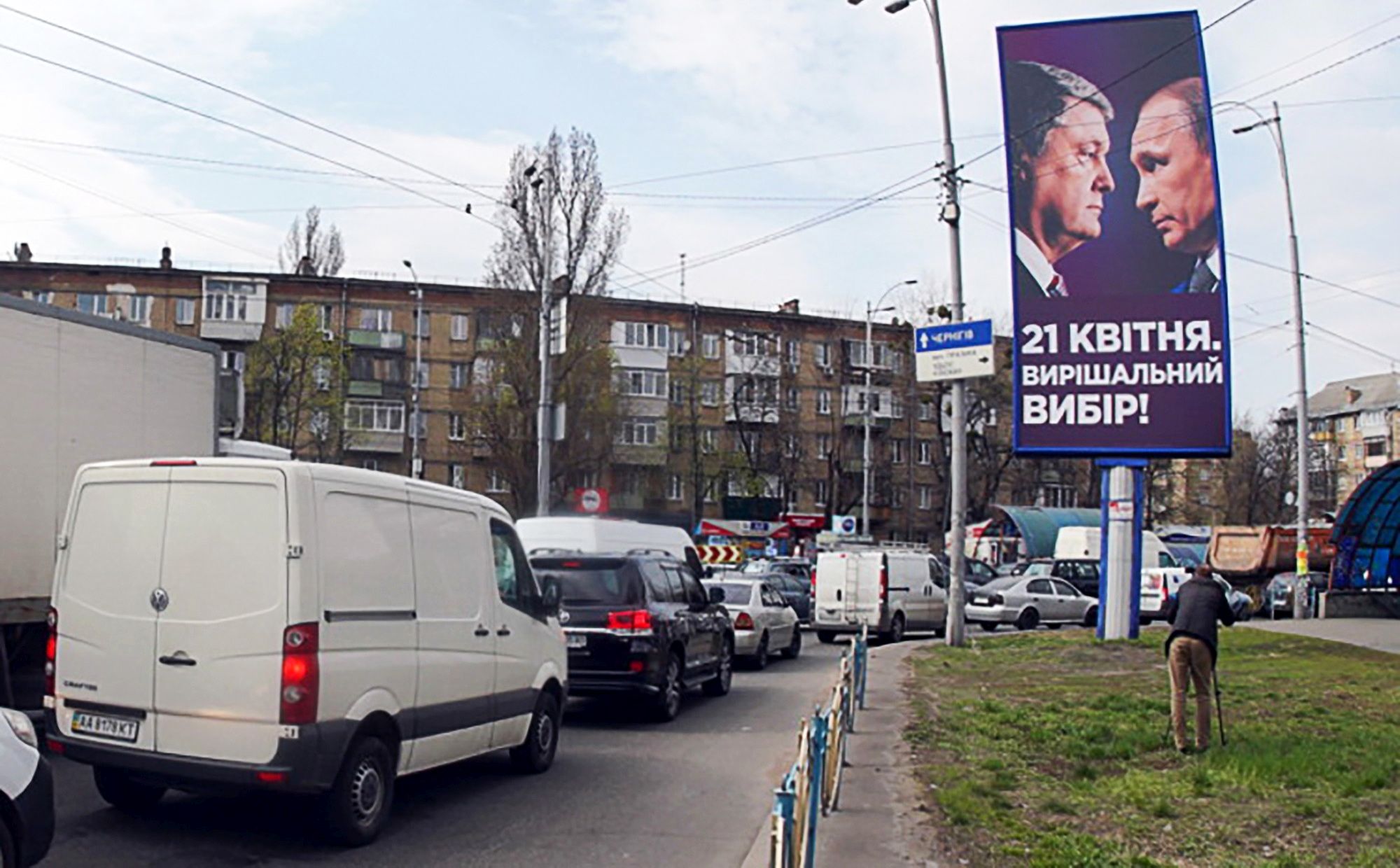 Предвыборный плакат Петра Порошенко с изображением Владимира Путина, Киев, 9 апреля 2019 года