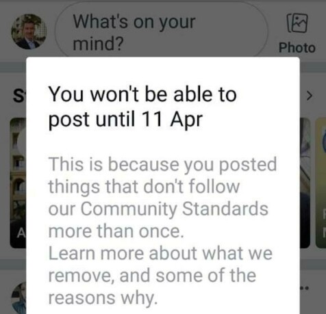 Сообщение Гаю Юлию Цезарю от Фейсбук о том, что он не сможет публиковать записи в соцсети до 11 апреля
