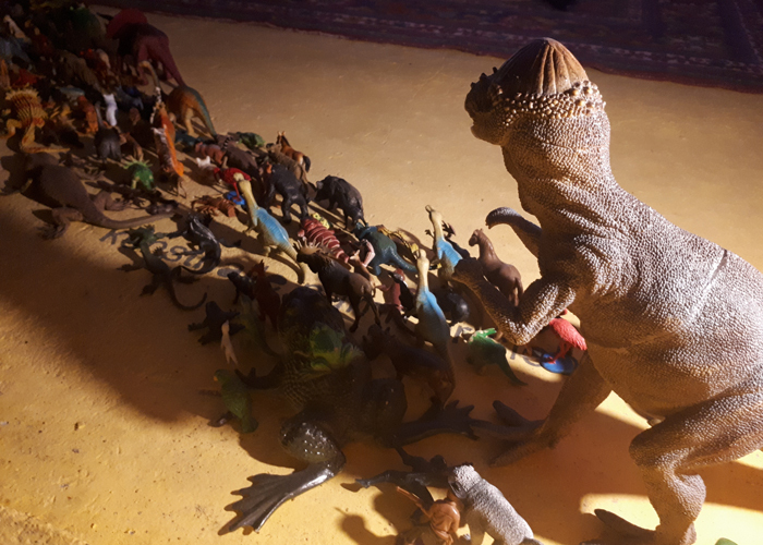 © А. Семенович Kunsthalle nummer sieben. Детали экспозиции Легенда следующая: Петроградку (и, возможно, весь мир) постигла катастрофа, в подвале на «Чкаловской» выживают и доживают последние люди. Мы приходим смотреть на останки цивилизации, артефакты вымышленной археологии, слепки из несуществовавших Помпеев и Геркуланума. Шкафчик с эротическими открытками, мумии котов, детская коллекция пластмассовых динозавров, изображающая не то караван до Ноева ковчега, не то исход в земли обетованные (рослый тираннозавр — в роли поводыря). В общем, иронический и сослагательный взгляд на то, что было бы после пресловутого «черного дня». Помимо самоиронии артефакты бункера радуют незаумностью и раскованностью. Это не замысловатые концепции кучки снобов, а будто финальная стадия детской игры в войнушку: «Эта цивилизация сломалась, несите следующую».