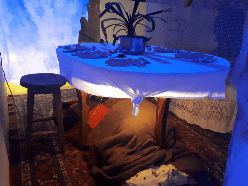 Массивный стол, тарелки, приборы, полуживой цветок, над всем — лампа с абажуром. Правда, приборы сделаны из натуральных костей, а под столом кто-то лежит, свернувшись. Колкость на тему «спать там, где есть»? Как и камера Чемакина, этот уголок театрален, похож на декорацию разговорного детектива под абажуром. Мимо стола шествуют динозавры — главный иронично-эпичный штрих в бункере. Динозавры мне понравились больше всего. Ради инсталляции даже не пришлось грабить детей — это все личная коллекция Лукаса, сына Петра Швецова, которую он несколько часов тщательно расставлял в камере. Есть тут и другие ископаемые животные: мумифицированные трупики кошки и котенка, найденные Вадимом Михайловым на чердаке. Если не приглядываться, можно и не найти, но останки кошки покоятся на очередном пиджаке от Михайлова, сидящем лицом к стене. Рукав-щупальце падает на пол.