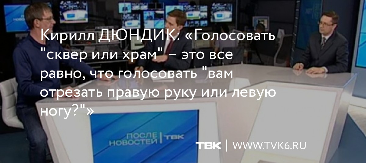«Голосовать "сквер или храм" – это все равно, что голосовать "вам отрезать правую руку или левую ногу?". То есть это совершенно несопоставимые категории, и это вообще не вопрос голосования. Если уйти в историю, то на самом деле храм образуется там, где образуется община, которая скидывается и начинает стоить храм. У меня вопрос: какая новая община, или насколько укрепилась красноярская община, чтобы возник это храм в честь чего? Храм не возникает на новом месте.Конечно, нельзя противопоставлять храм и сквер, но это же кто-то сделал? Здесь одна из серьезнейших ошибок, что власть в этот вопрос вмешалась. Как это должно было быть, чтобы было общественное согласие: люди должны прийти в мэрию и попросить построить храм. Я не слышал о таком, это прошло мимо меня, я внимательно за этим слежу», – говорит политолог Кирилл Дюндик.
