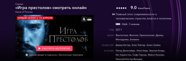 - Бесплатный период. На момент публикации на сервисе есть следующие триал-периоды (включающие «Игру престолов»):