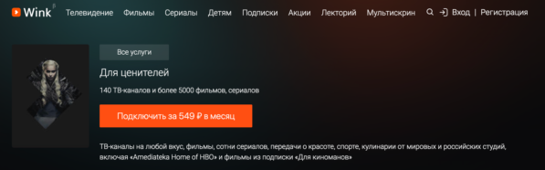 - Что входит в подписку. Wink — мультимедийная платформа, объединяющая в себе онлайн-кинотеатр и площадку для трансляции ключевых событий. На ней более 200 ТВ-каналов различных тематик в отличном качестве: спорт, новости, кино и сериалы, детские каналы, десятки тысяч фильмов ведущих российских и мировых студий. Наиболее выгодные подписки — «Для любителей», «Для киноманов» и «Для ценителей», которые включают тысячи фильмов и более 100 телеканалов. На все три сейчас действует скидка.