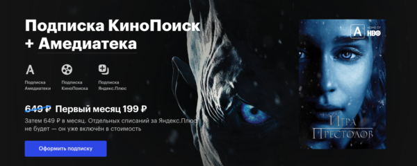 - Стоимость подписки. Для тех, у кого есть подписка на «Яндекс.Плюс» — 199 рублей за первый месяц, со второго месяца — 480 рублей. Для всех остальных — 649 рублей в месяц.