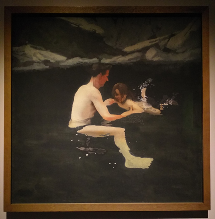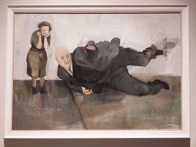 © Галерея Тейт Р.Б. Китай. Убийство Розы Люксембург. 1960. Бумага, монтированная на холст, масло, чернила, графит. 153х152,4 см На мой взгляд, настоящим открытием на этой выставке выглядят не Ауэрбах и Коссоф (все же при близком соседстве с экспрессией Бэкона и Фрейда они неизбежно проигрывают), а Майкл Эндрюс. Прямолинейность и нарративность его картин каким-то чудом удерживаются на грани, не проваливаясь в картпостальность. Падающий человек в исполнении Эндрюса — не обобщенный образ падения, а вполне конкретный пожилой респектабельный мужчина, предположительно глава семейства, который непонятно почему упал на глазах пожилой женщины, всплеснувшей руками («Внезапно упавший мужчина» (1952)). Удивительна и картина «Мы с Мелани плаваем» (1978—1979), где в черной воде на фоне серых камней художник учит свою дочь плавать. Можно разгадывать символизм этих работ, а можно принять все как есть, в почти даосской прямоте и чистоте сиюминутного события, повторяющегося изо дня в день и из века в век. Персонажи Эндрюса оказываются плоскими знаками, будто бы приклеенными, приколотыми булавкой к плоскости обстановки или ситуации. То же впечатление оставляет и многофигурная, по-барочному динамичная, импрессионистически-декадентская картина «Олений заповедник» (1962), вдохновленная романом Нормана Мейлера. Богемные персонажи разных времен, похожие на расплывшиеся от дождя вырезки из журналов, сплавлены в единый живописный коллаж.