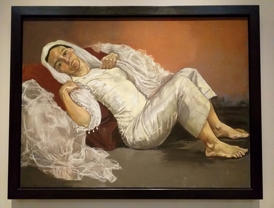 © Галерея Тейт Юэн Аглоу. Обнаженная. 1962—1963. Холст, масло. 163,2х116,8 см Когда переводишь взгляд на висящие рядом работы Фрейда и Регу, контраст заставляет предельно прочувствовать разницу художественных подходов. Огромная пастель «Невеста» Паулы Регу из серии «Женщина-собака» (1994) — жесткая, иронично-злая работа. Женщина лежит на диване в подвенечном платье, и ее лицо и тело вылеплены художницей так, что сложно понять, красивая она или нет, мертвая или живая, молодая или старая. Последнее роднит произведение Регу с обнаженными портретами Фрейда. Впрочем, тут, наверное, будет уместно определение «голые портреты». Изображаемые художником люди одновременно антиаполлоничны и антиреалистичны, если под реализмом понимать то, какими мы видим наших ближних в неприукрашенном состоянии. В их позах, расположении и интенсивности тел, превосходящей интенсивность лиц, есть нечто неестественное, лабораторно-исследовательское. Это «постановки наоборот»: в них на первый план выходит не физический каркас выносливого тела с его гармоничными составляющими (как у Аглоу), а причудливая кожаная оболочка, одухотворенная изнутри чем-то немощным и слабым, но все же подающим знаки существования.