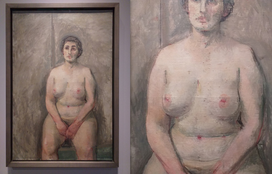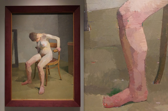 © Галерея Тейт Уильям Колдстрим. Сидящая обнаженная. 1952—1953. Холст, масло. 106,7х70,7 см Иной подход отличает Уильяма Колдстрима, склонного рационально, математически анализировать изображаемый объект, оставляя различные измерительные черточки и пометки прямо на его теле. Этот подход подхватил и практически довел до маниакальности его знаменитый ученик Юэн Аглоу: создавая всего по несколько работ в год, он никогда не стремился перевести их со стадии студенческой постановки в стадию картины. Его сухие модели на невыразительном фоне буквально испещрены пометками и «стигмами» измерений, что в свете исторических событий первой половины XX века выглядит одновременно устрашающе и абсурдно. К чему стремится — или, скорее, от чего спасается — этот «Поликлет»? О чем не хочет говорить, желая обойтись монотонными и долгими сеансами проверки своего глазомера, когда на дворе, допустим, 1960-е годы? По мнению художника, состояние модели должно было оставаться максимально статичным и уравновешенным — даже в том, что касается цвета кожи. Известно, что однажды в мастерскую к Аглоу зашел Люсьен Фрейд, до того пытавшийся соблазнить его модель. В этот момент девушка покраснела, Аглоу немедленно заметил колористическое изменение, жутко разозлился и выгнал друга.