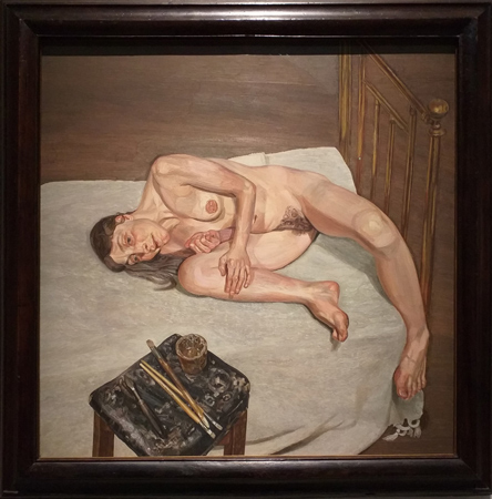 © Галерея Тейт Люсьен Фрейд. Ли Бауэри. 1991. Холст, масло. 51х40,9 см Темы войны и дружеских связей явно недостаточно для редуцирования «Лондонской школы» до шести-десяти авторов: по этим критериям в выставку вполне вписались бы и такие авторы, как Дэвид Хокни, Питер Блейк и Говард Ходжкин, чья картина находится на обложке книги Алистера Хикса «Лондонская школа: возрождение современной живописи» (1989). Хикс, кстати, причисляет к «Лондонской школе» и таких авторов, как Джон Беллани, Джиллиан Эйрс, Морис Коккрилл, Тереза Аултон, Кен Кифф и Хьюи О'Донохью. Думаю, кураторам следовало начать с более подробного раздела с текстом об истории этого термина и связываемых с ним имен (или хотя бы дать соответствующую статью в каталоге).