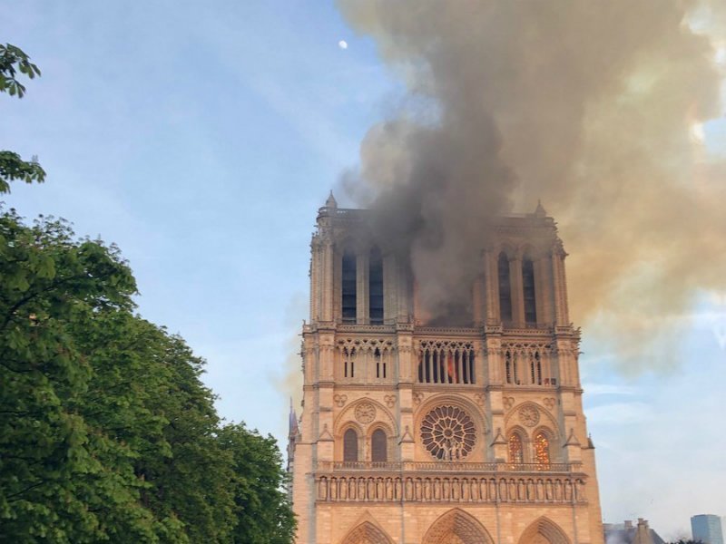 В результате пожара, который начался около 18:30 на чердаке собора Парижской Богоматери (Нотр-Дам-де-Пари), полностью обрушились шпиль и крыша храма, уничтожены башенные часы, и огонь перекинулся на несущую конструкцию. По стенам здания побежали трещины.