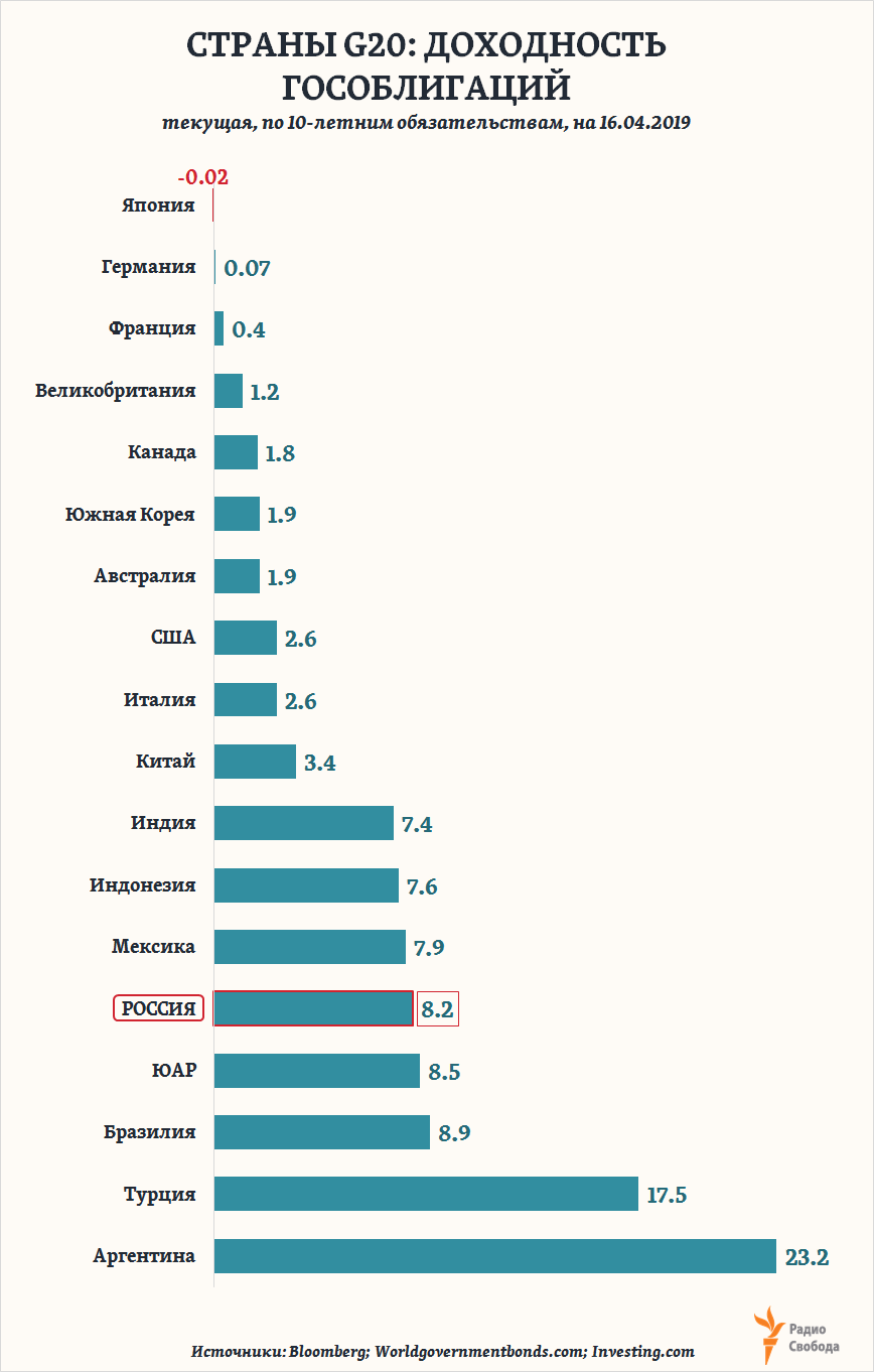 Однако г-н Кудрин говорил также о “дороговизне” российского госдолга. То есть о тех процентах по нему, на величину которых инвесторы, готовые покупать этот долг, оценивают собственные риски. Речь идет прежде всего о внутреннем государственном долге России, 95% которого приходится сегодня на так называемые “облигации федерального займа” (ОФЗ). К началу марта 2019 года более четверти (25,9%) всех вложений в российские ОФЗ, по данным Центрального банка России, приходилось на долю зарубежных инвесторов.