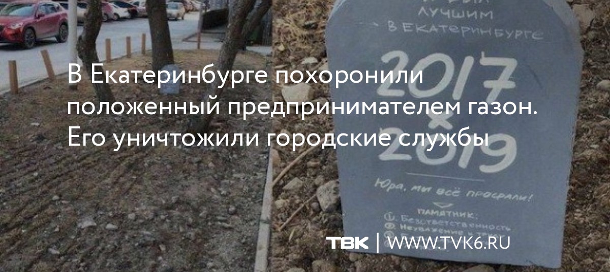 В Екатеринбурге устроили похороны газону. Место в центре на свои деньги благоустроил предприниматель, однако городские службы, прокладывая кабель, уничтожили зеленое покрытие и не восстановили после этого газон.
