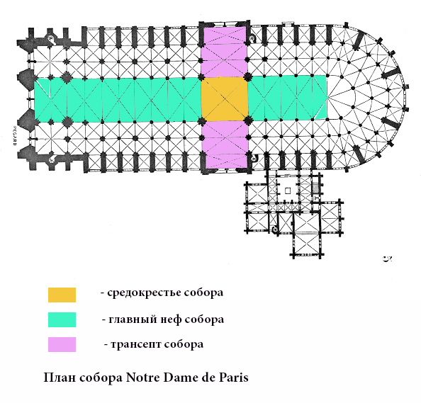У собора Нотр-Дам де Пари достаточно архаичный для готики пятинефный план (неф — это продольное пространство между рядами опор) и выступающий к северу и югу трансепт (поперечный неф, образующий при пересечении с главным продольным нефом средокрестье), над которым возвышался шпиль. (Рис. 1.) С западного фасада возвышаются две башни-колокольни. Два боковых нефа сильно ниже центрального, трансепт по высоте равен центральному нефу. Внутреннее пространство собора (дальше речь будет только о центральном нефе и трансепте) перекрыто раннеготическими шестичастными нервюрными сводами.
